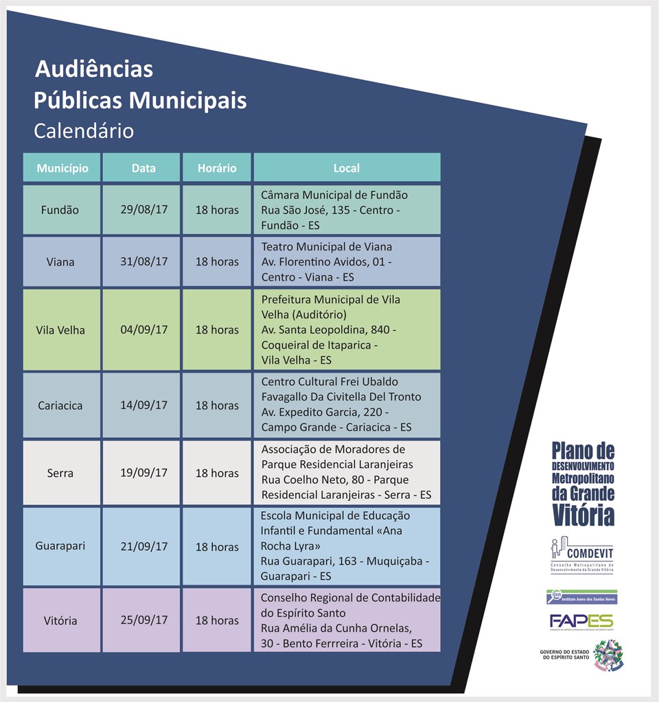 Desde 2001, a Região Metropolitana da Grande Vitória (RMGV) é formada por Cariacica, Fundão, Guarapari, Serra, Viana, Vila Velha e Vitória. A partir da semana que vem, o PDUI iniciará uma nova etapa com as audiências públicas, a serem realizadas em cada um desses municípios. A primeira ocorrerá em Fundão, no próximo dia 29, na Câmara municipal, a partir das 18 horas. Todas as audiências são abertas ao público em geral.